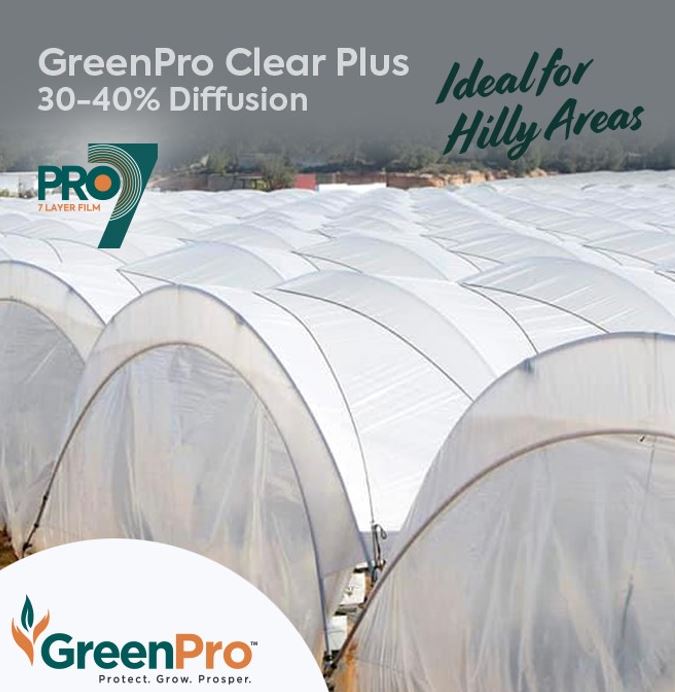 Màng GreenPro Clear Plus 7 lớp được thiết kế cho các vùng có ít ánh sáng, khí hậu lạnh, vùng đồi núi. Là loại màng cho phép nhiều ánh sáng nhất trực tiếp đi qua màng, giúp cây có thể nhận được nhiều năng lượng hơn cho quá trình quang hợp